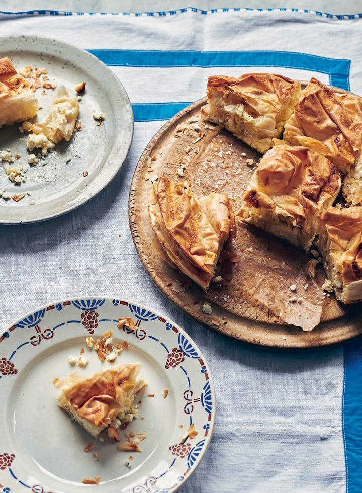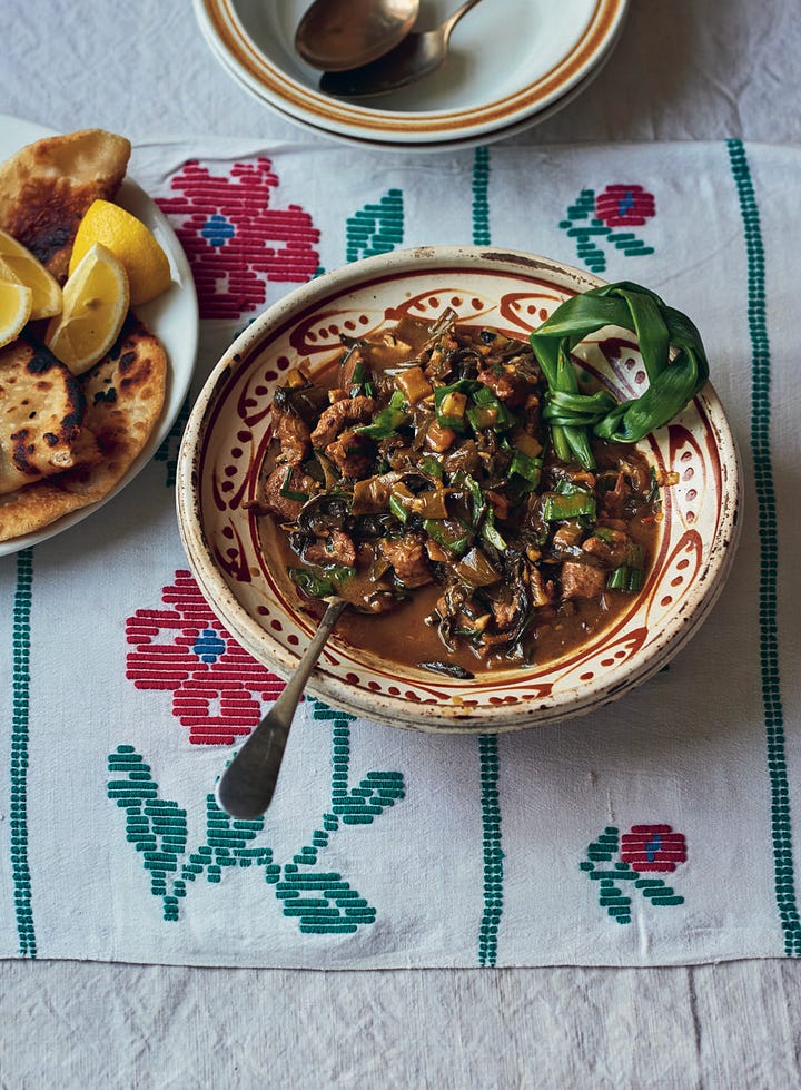Stufat, lamb and spring onion stew, and Dobrogeana, cheese pie, from “Danube” cookbook